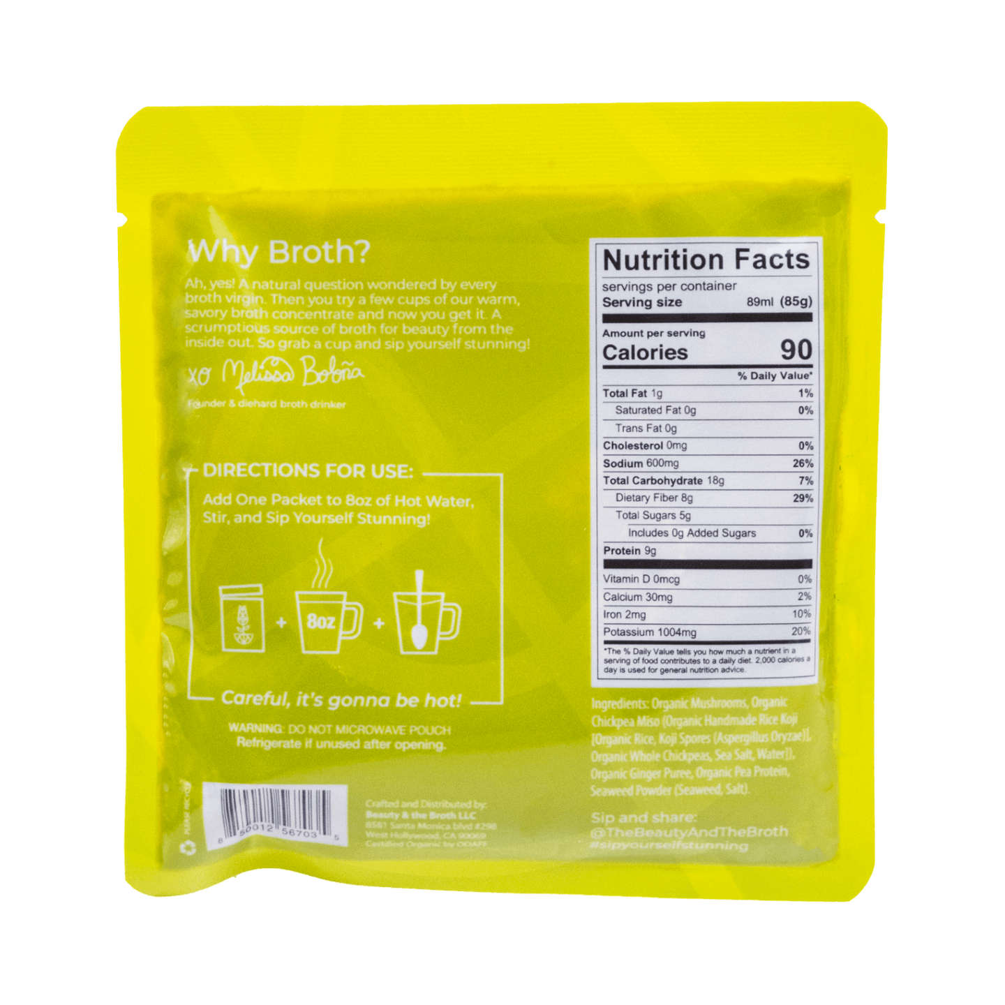 Layered savory notes of organic ginger, organic chickpea miso, organic mushroom, seaweed powder and sea salt make the robust flavor...